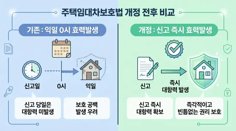 현행법(2026년 3월 기준)에서는 전입신고한 다음 날 0시부터 대항력이 발생합니다. 다만 정부가 2026년 3월 10일에 ‘전입신고 처리 시 즉시 대항력 발생’으로 변경하는 법 개정을 추진 중이에요. 개정안이 국회를 통과하면 당일 즉시 효력이 생기게 됩니다.