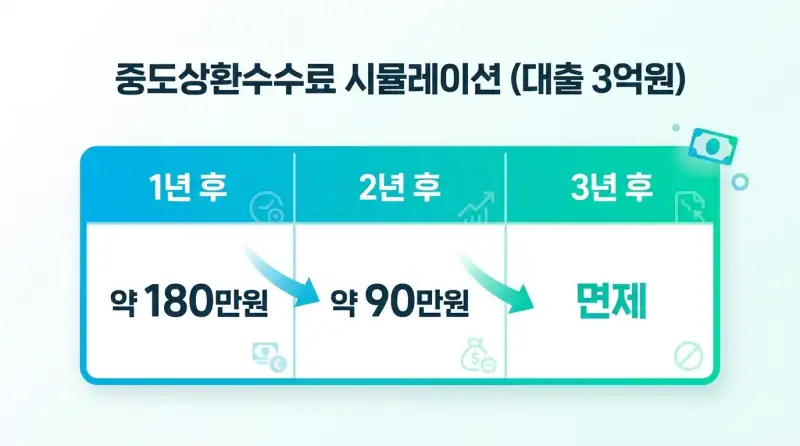 3억 원 주담대 기준 중도상환수수료를 시점별로 직접 계산해봤습니다. 2026년 은행별 수수료율 비교, 면제 조건, 수수료 대비 이자 절감 효과까지 실전 예시로 정리합니다.