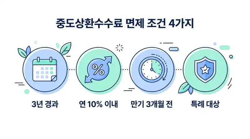 두 번째는 연간 10% 이내 상환이에요. 부동산 담보대출의 경우, 매년 최초 대출금액의 10% 이내를 상환하면 해당 금액에 대해서는 수수료가 면제됩니다. 3억 원 대출이면 매년 3,000만 원까지는 수수료 없이 갚을 수 있는 거죠. 다만 일부 은행이 이 우대 정책을 축소하거나 조건을 변경하는 경우도 있으니, 본인 대출 약관을 꼭 확인해야 해요.