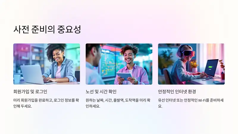 원하는 날짜, 시간, 출발역, 도착역을 사전에 체크해두세요. 코레일 홈페이지에서 제공하는 열차 시간표를 통해 예매 계획을 세우는 것이 좋습니다.
