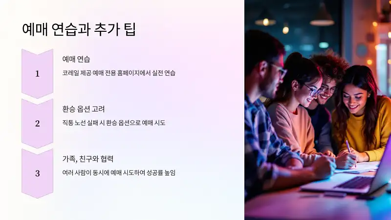 인기 노선은 특정 시간대에 경쟁이 집중됩니다. 따라서 비인기 시간대를 노리거나 환승 옵션을 고려해 예매를 시도해 보세요. - 추천 시간대: