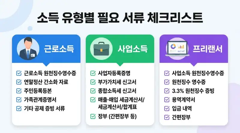 소득 유형별 필요 서류 체크리스트 근로소득, 사업소득, 프리랜서로 구분하여 각 유형별 필요 서류를 비교하는 인포그래픽